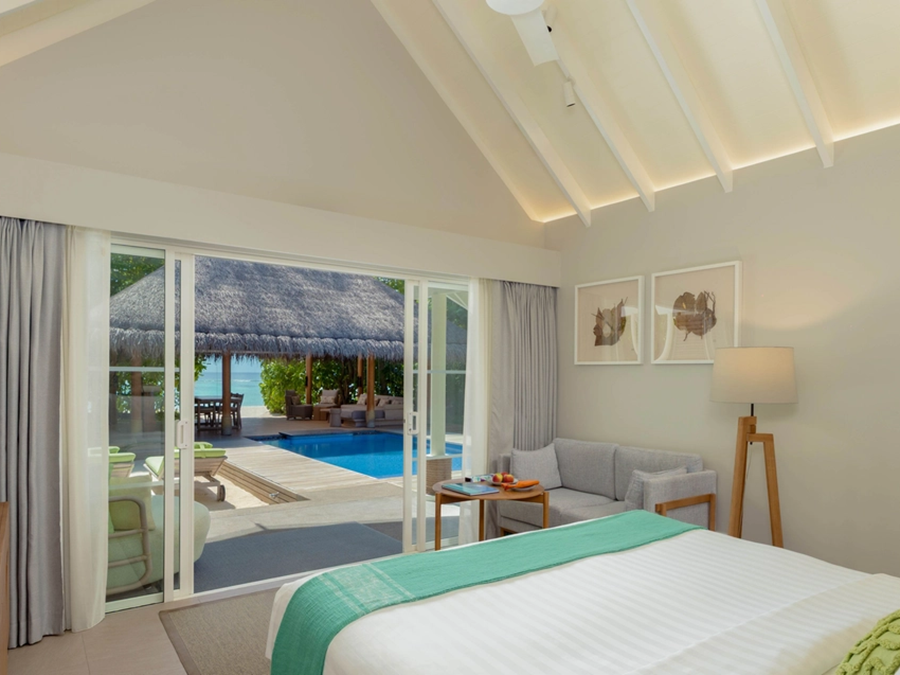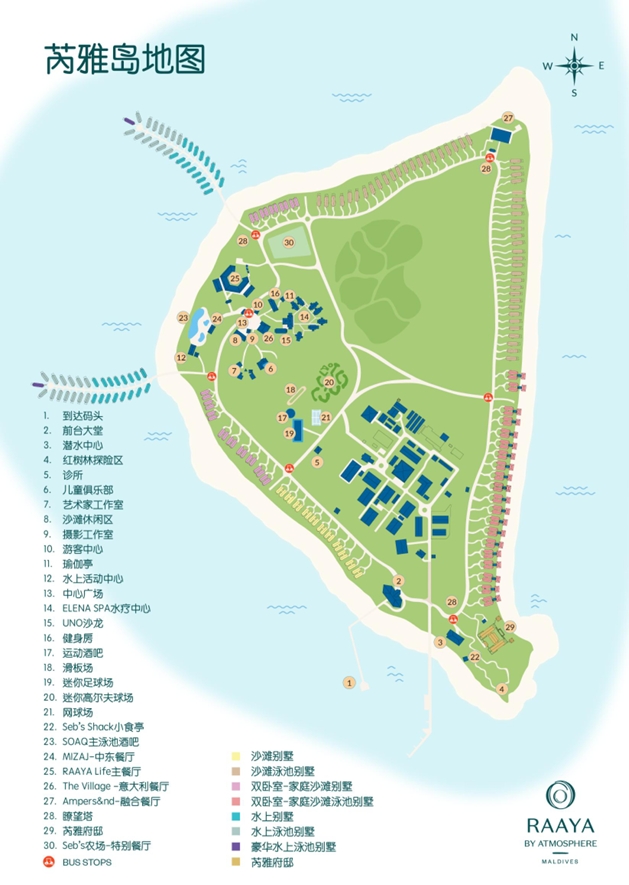 芮雅岛(Raaya By Atmosphere),前身是阿玛瑞莱亚岛 (Amari Raaya Maldives)于2023年8月1日正式开业,酒店定位为豪华五星,前身由泰国ONYX酒店集团建造并管理。但是从2024年4月1日正式开始更名芮雅Raaya By Atmosphere,变成一价全包酒店,由“艾茉菲儿酒店集团”经营并管理。酒店坐落在拉环礁(Raa Atoll),从马累出发乘坐45分钟水飞即可到达。整个岛屿位于一个超大潟湖之上,海水呈现果冻蓝,属于中大型岛屿,岛上总共建有187间别墅,5间餐厅(准确的说是3家餐厅+2个小吃餐吧)和3间酒吧,房型和餐厅众多,能够满足不同客人的需要。总体来讲,自从艾茉菲儿接手以后,对硬件进行了一定的升级改造,并且更加重视中国市场,不管从设施还是服务来讲,都还不错。
