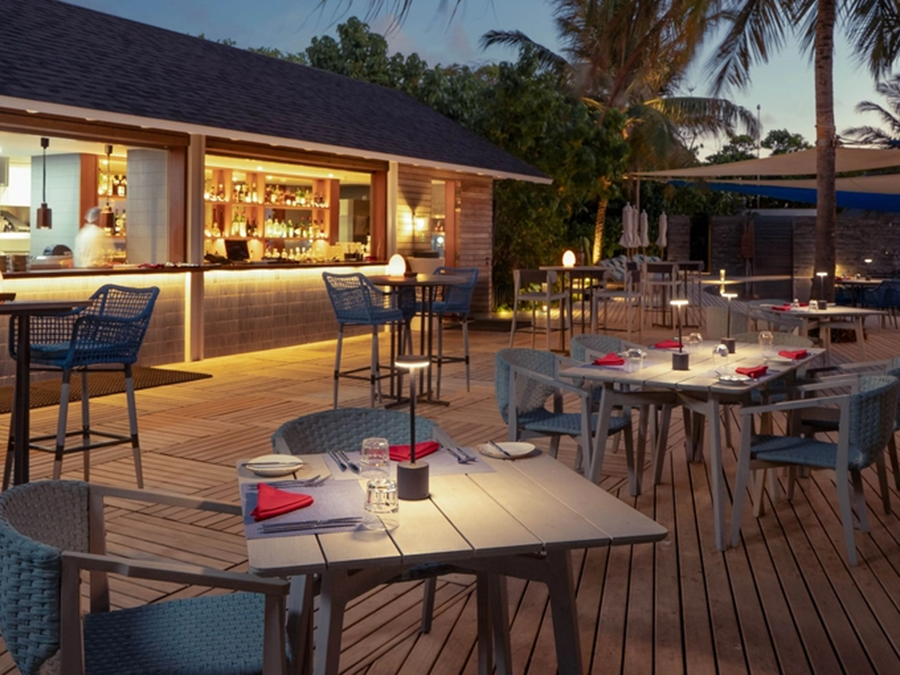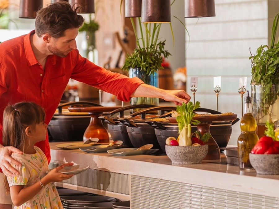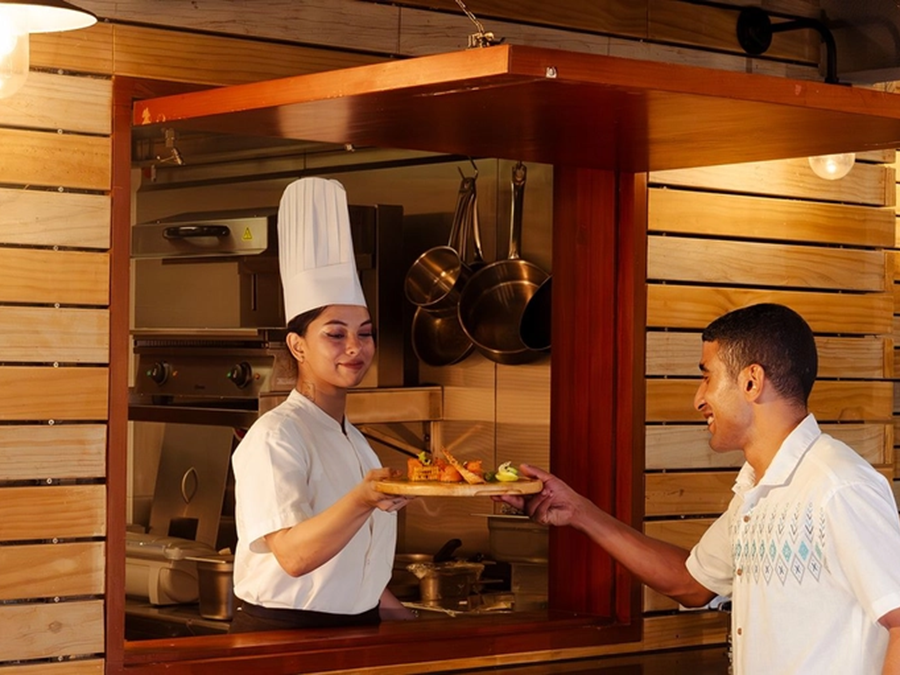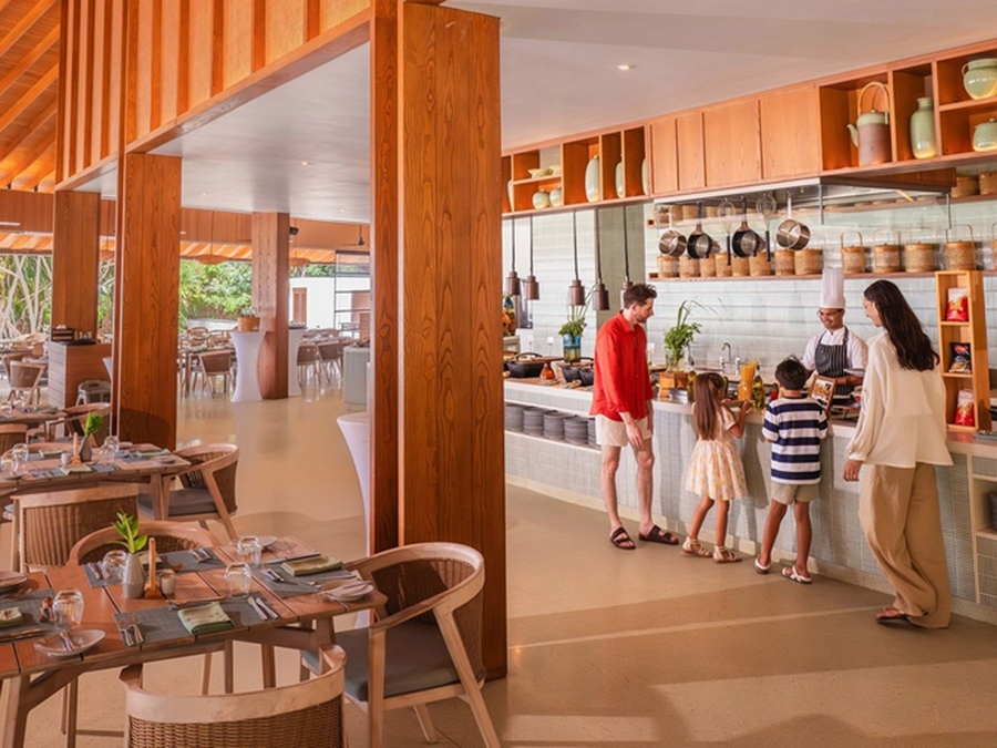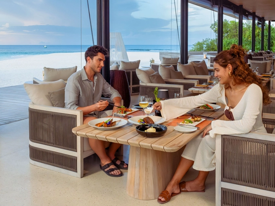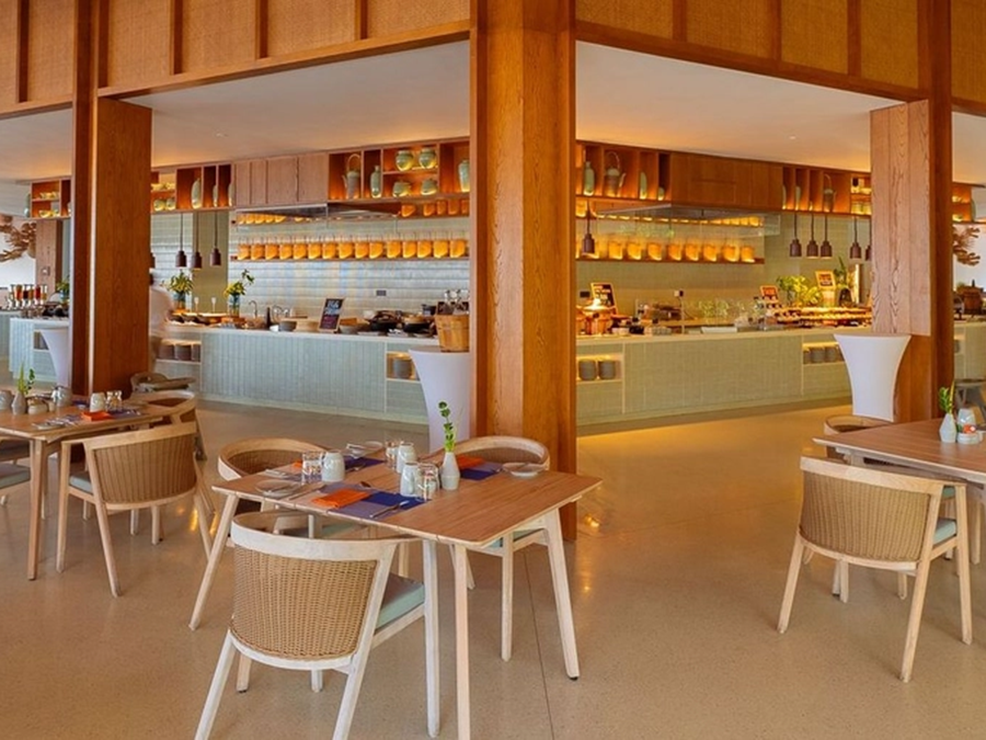 餐厅介绍:主餐厅全天开放,供应各种风味早中晚三餐,主要以自助餐为主。如果你是商务接待或者需要有安静的私人空间用餐,也可以提前预约,餐厅会尽量安排。RAAYA Life 提供亚洲、欧洲和马尔代夫美食的自助餐,配有现场烹饪台、沙拉吧和甜点展示。 这是一家布置精美的现代全天餐厅,可俯瞰壮丽的海景。空间充满生机与活力,氛围轻松。 -