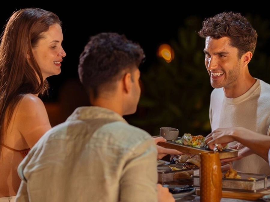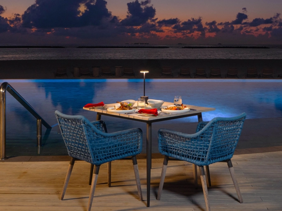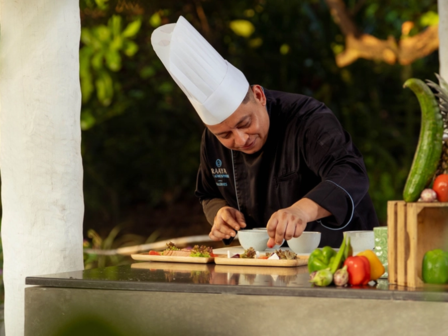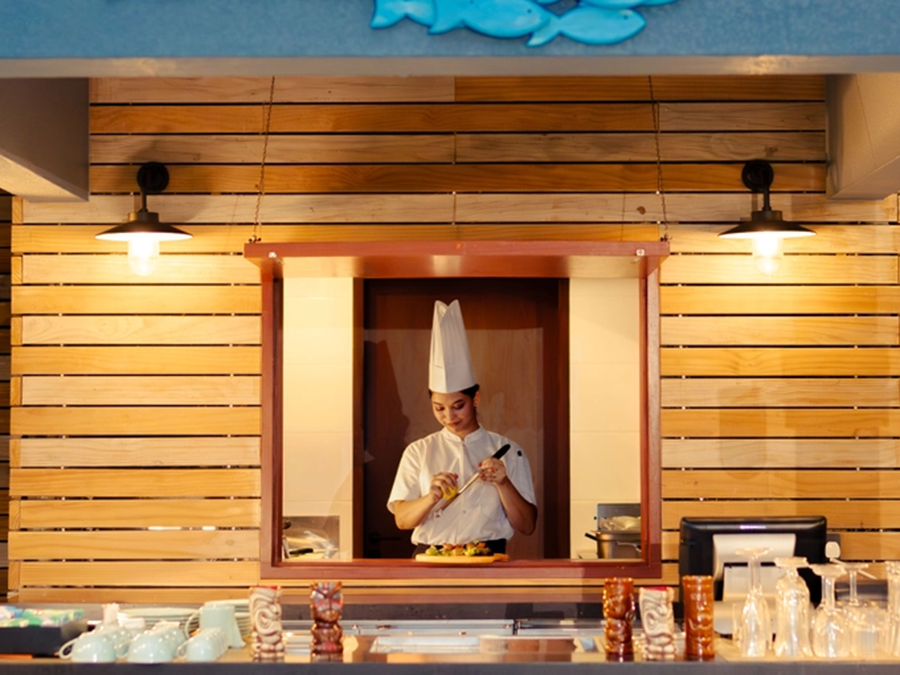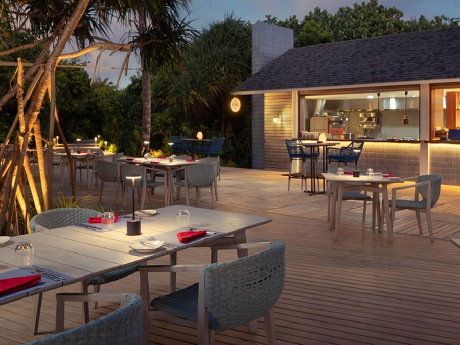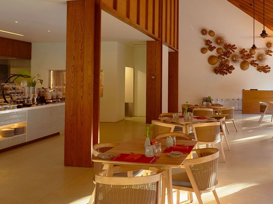 餐厅介绍:主餐厅全天开放,供应各种风味早中晚三餐,主要以自助餐为主。如果你是商务接待或者需要有安静的私人空间用餐,也可以提前预约,餐厅会尽量安排。RAAYA Life 提供亚洲、欧洲和马尔代夫美食的自助餐,配有现场烹饪台、沙拉吧和甜点展示。 这是一家布置精美的现代全天餐厅,可俯瞰壮丽的海景。空间充满生机与活力,氛围轻松。 -