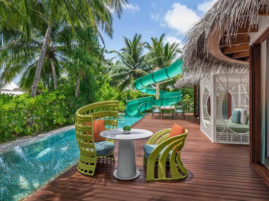 第三,酒店房间都带私人泳池,沐浴用品皆为国际大牌。另外还有水飞上岛、软饮补给、时尚酒店,双层沙屋(Wonderful Beach Oasis)这些配置,更是让人感动不已,完全可以满足你对马尔代夫所有对幻想。