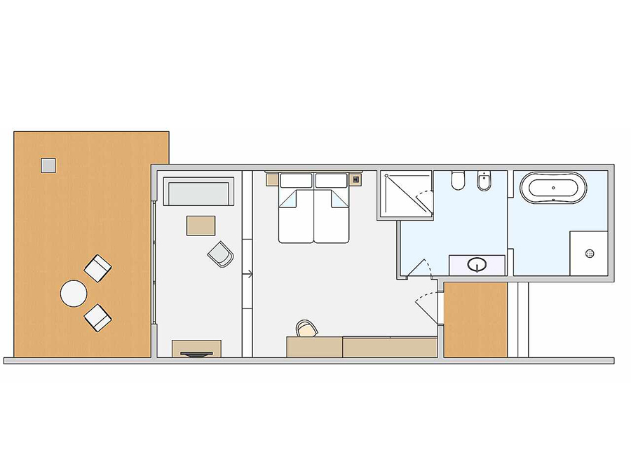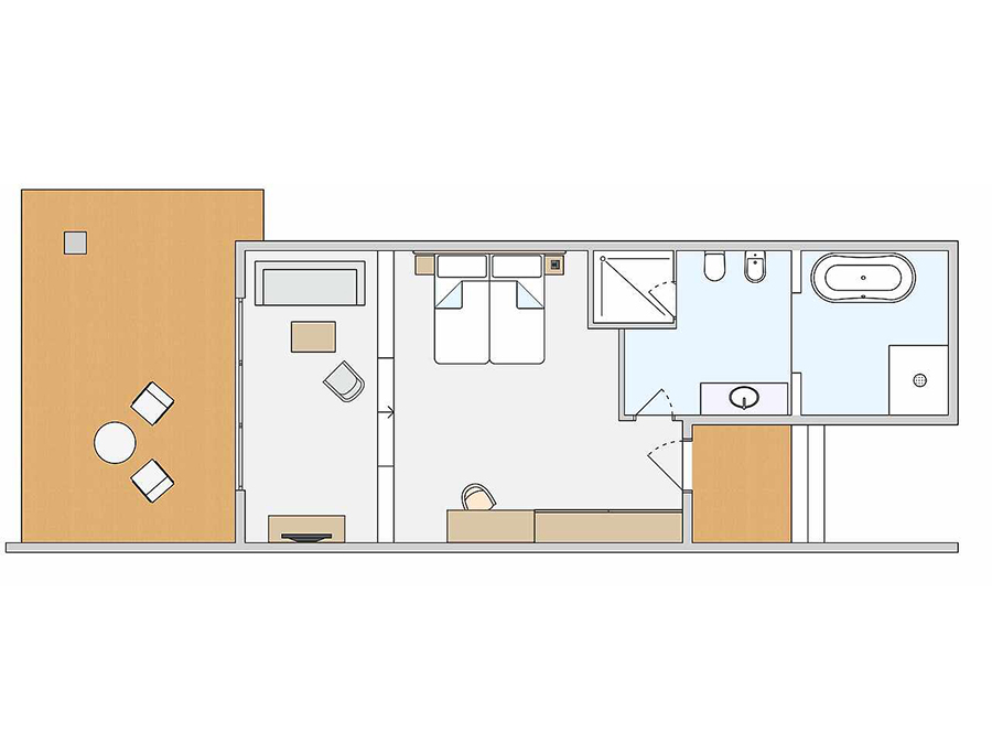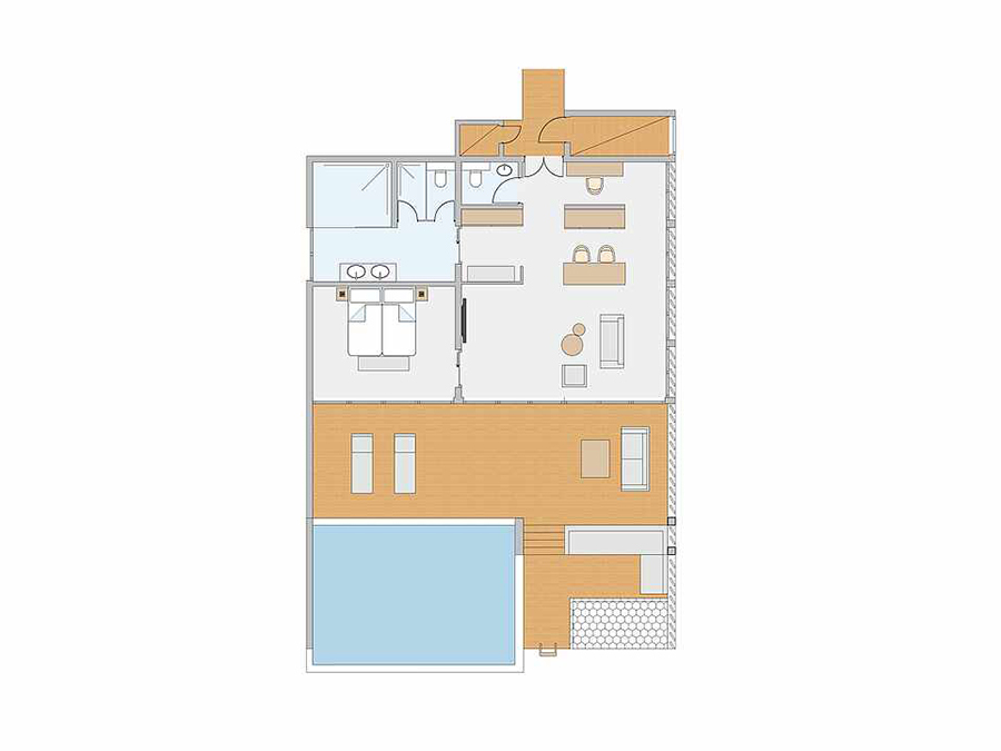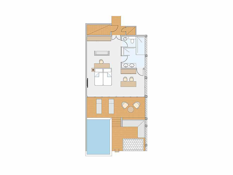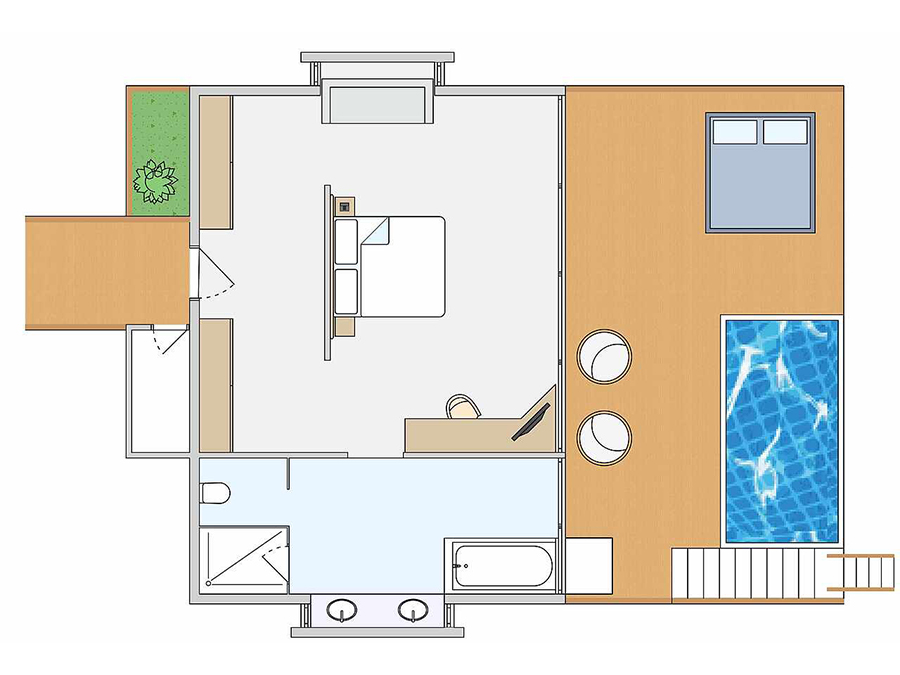 房型介绍:需要注意的是,此房型并没有对国内客户开放。卧室和客厅由2个台阶隔开,卧室配有特大号床,设有露台,户外浴室设有淋浴花洒、浴缸、卫生间、吹风机、化妆镜等。提供保险箱、冰箱、平板电视、电话和无烟区。 -