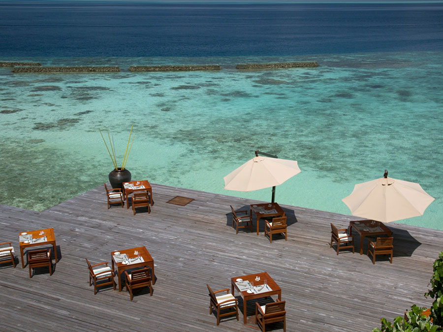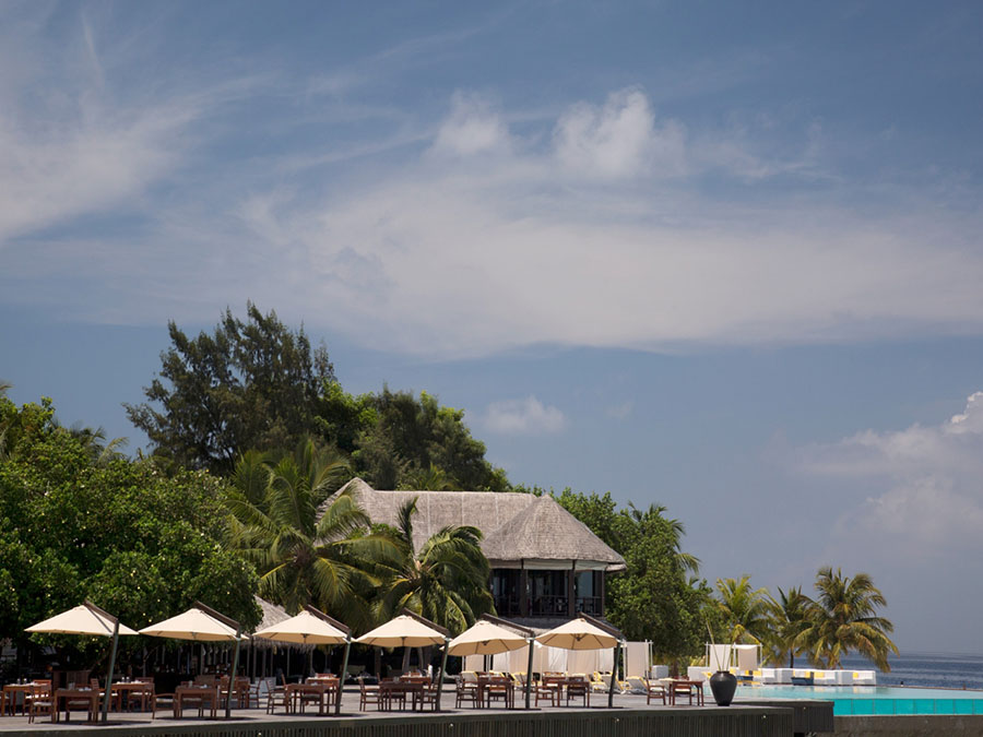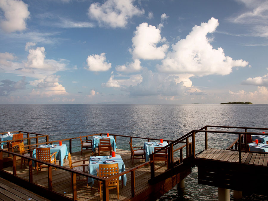 餐厅介绍:岛上的主餐厅,位于主泳池旁边,可以提供早中晚三餐自助餐;需要注意的是用餐期间尽量衣着整齐,穿长裤用餐,如果穿短裤,餐厅会给你一条半身围裙。这里的自助早餐有各类新鲜的水果拼盘,甚至是中国鱼粥,都是应有尽有。午餐可以提供沙拉、马尔代夫特色菜、烤肉等点菜。自主晚餐每天会有不同的主题,有印度菜、阿拉伯菜、意大利菜或法国菜等等,特别是星期五晚上,会特别丰盛。